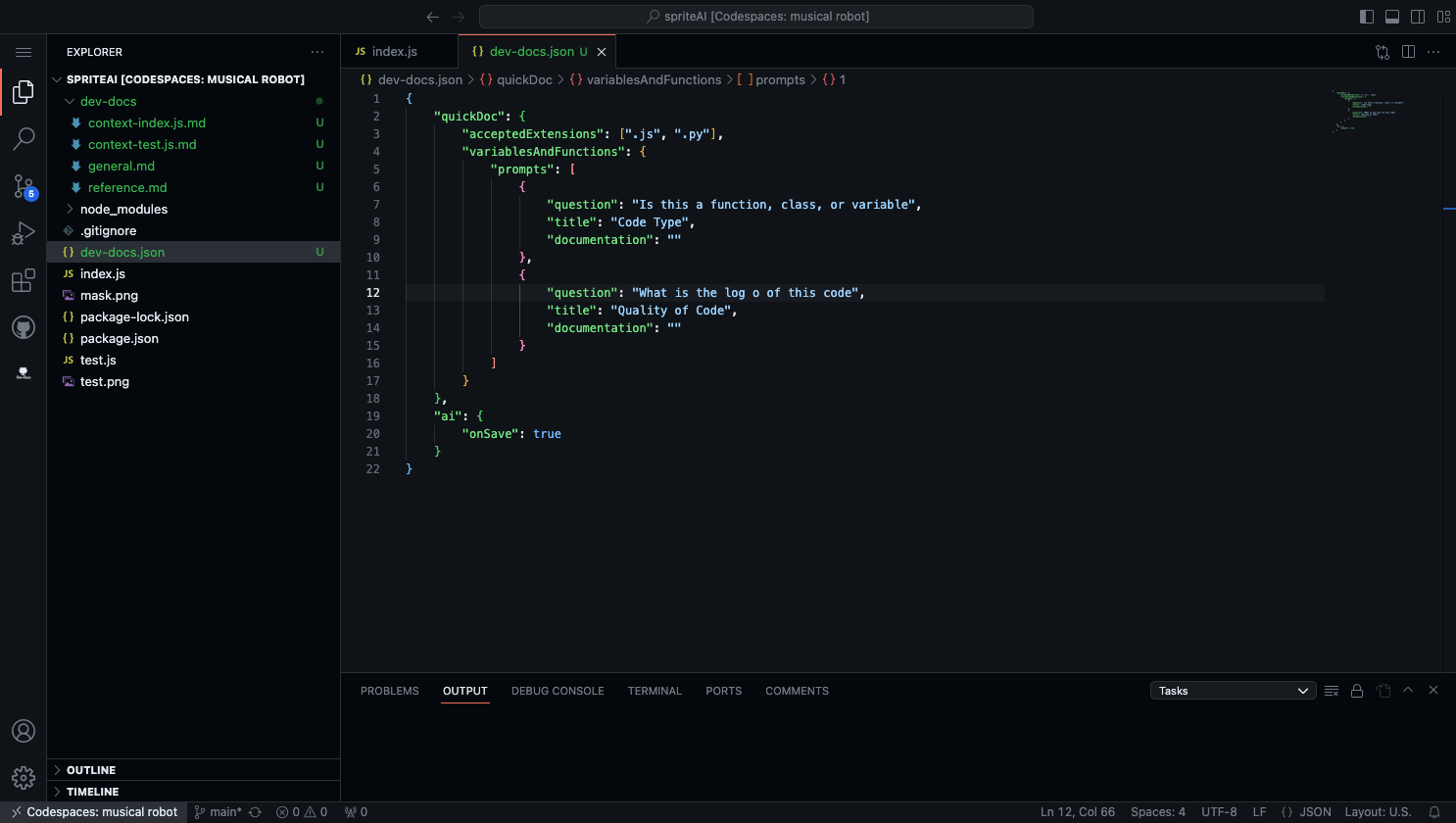 To get started, open our hello world repo that has a sample dev-docs.json file already configured.