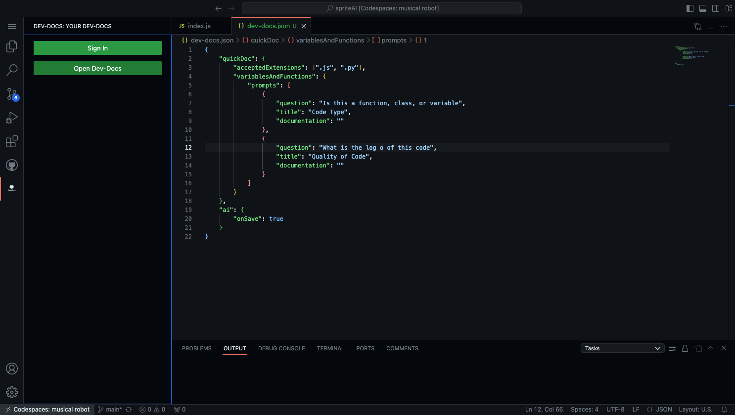 You can then customize the questions you want the AI To answer from your code by adusting the questions in the JSON or adding new ones to the JSON. The title can be thought of as a header within your documentation. Here you can also set the AI to run every time you save by keeping the "onSave" prompt as true. Alternatively, you can turn the auto generate on save feature off by setting the "onSave" prompt to false.