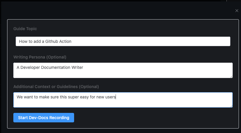 - Additional Context (Optional): Think of this as extra instructions or context to help Dev-Docs write your guide.